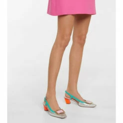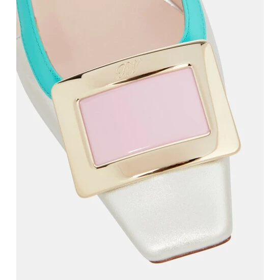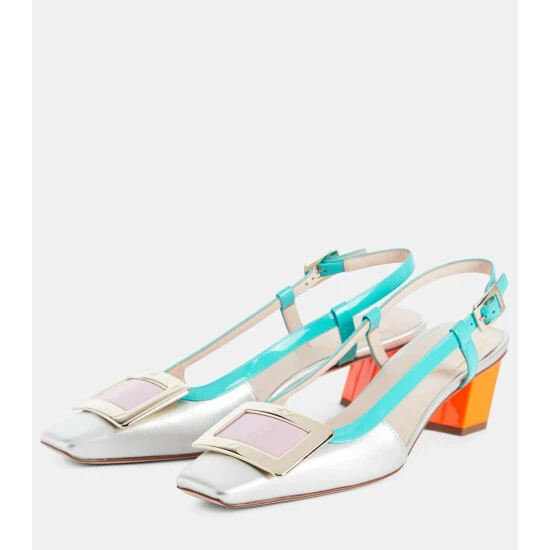 A label signature, Roger Vivier’s Belle Vivier pumps show the enduring lure of ‘60s design cues. Defined by their discerning square silver-toned buckles and coordinating toes, the slender slingback silhouette is crafted from colorblocked panels of leather and set atop slanted 45mm block heels that exude elegance with every step.