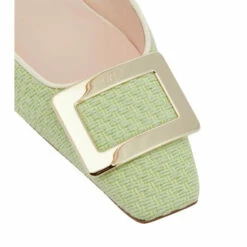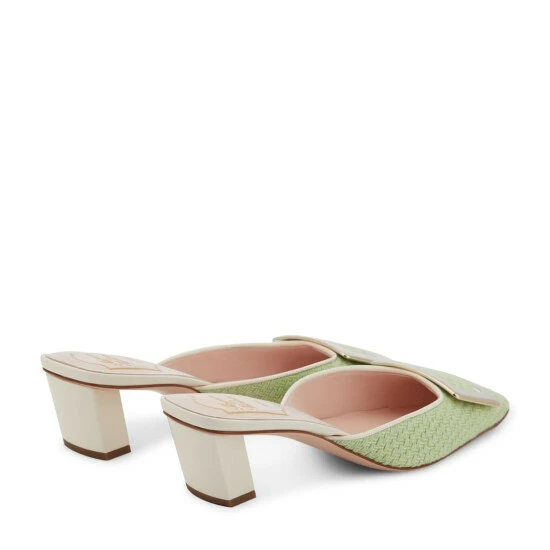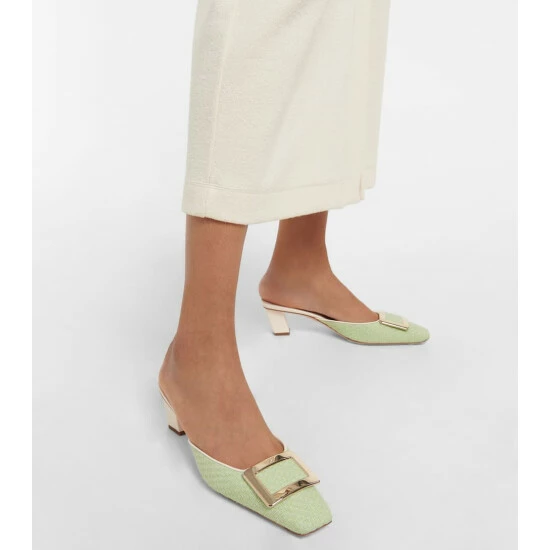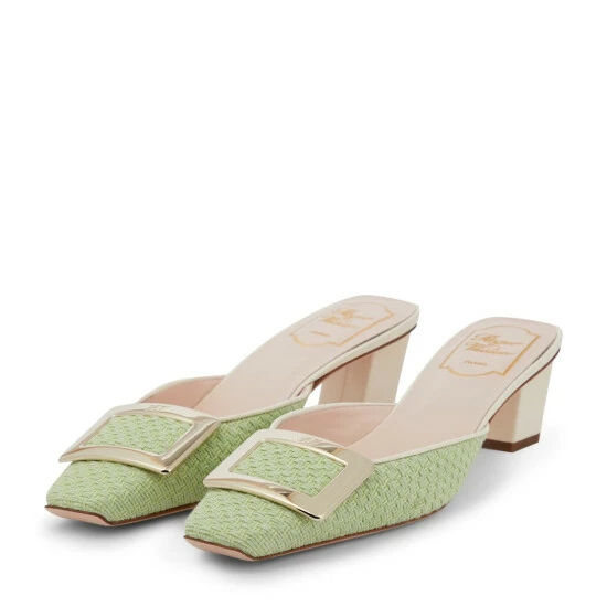 Roger Vivier’s iconic Belle Vivier design undergoes a transformation, appearing here as a mule. It’s made in Italy from bouclĂ© with square toes, slanted block heels, and the label’s signature buckle â celebrated throughout French film and culture since 1965.