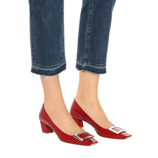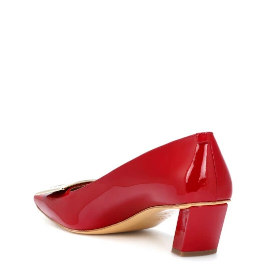 Accent your work wardrobe with Roger Vivier’s Belle Vivier patent leather pumps. With a smooth finish and warm red hue, modest slanted heel and metal buckle, they’ll prove an easy pick for grown-up glamour.