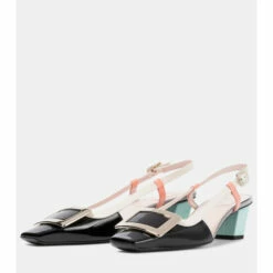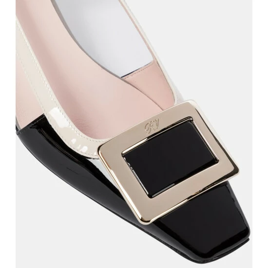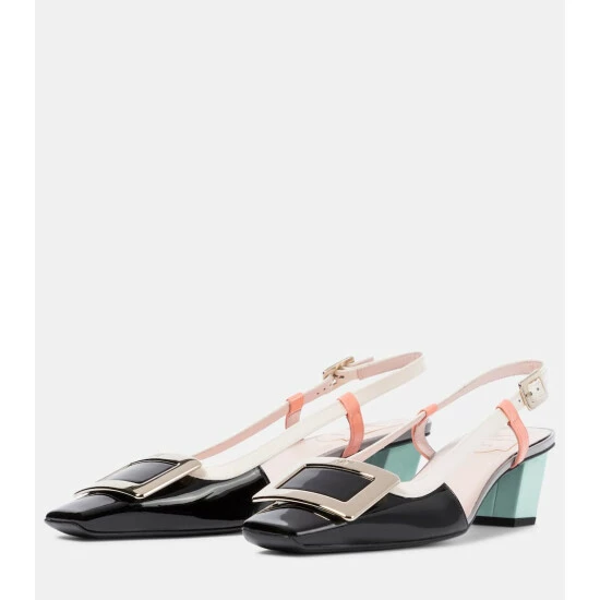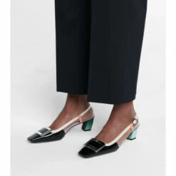 Roger Vivier’s iconic Belle Vivier silhouette undergoes a transformation, appearing here as patent leather slingback pumps. The style celebrates its 55th anniversary with an evocative colorblocked design, and the self-same chrome-plated buckles – by now a powerful brand signature.