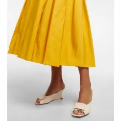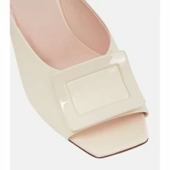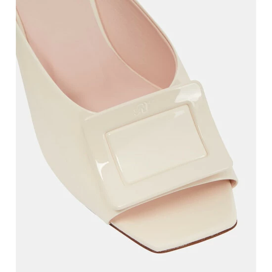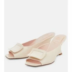 Roger Vivier’s iconic Belle Vivier design undergoes a transformation, appearing here as a wedge mule. They’re made in Italy from patent leather and set on slanted wedge heels.