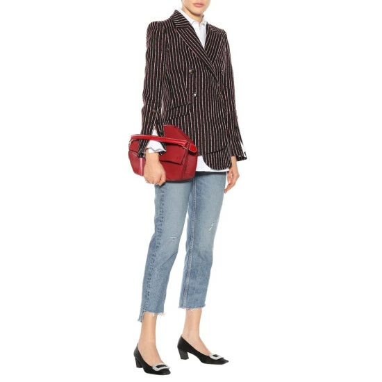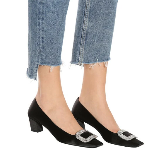 Featuring the label’s signature buckle in bright silver-tone metal with crystals, Roger Vivier’s Belle Vivier pumps are a sparkling, sophisticated option. We love the lustrous black satin and slanted heel on this made-in-Italy style.