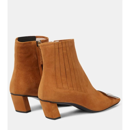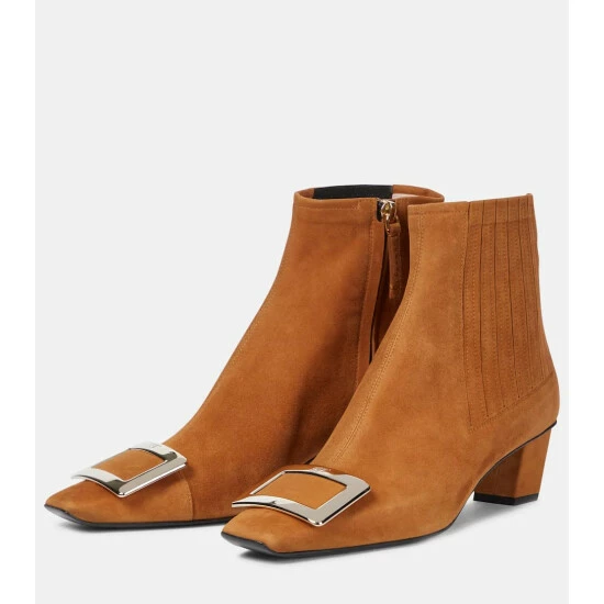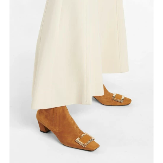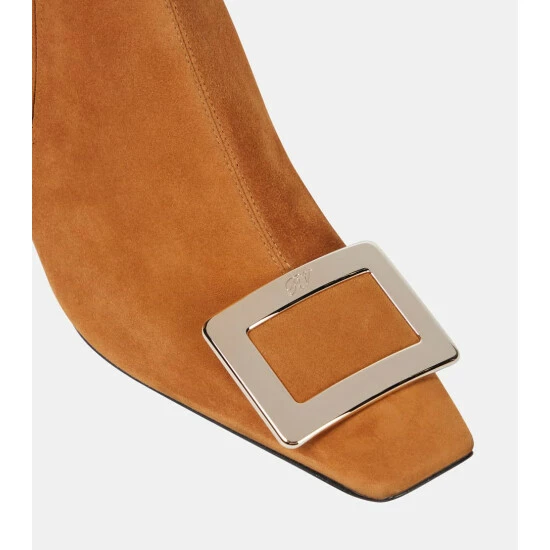 One of Roger Vivier’s most iconic styles, the Belle Vivier boot is handcrafted from suede featuring a signature crystal buckle and high heel. This style comes in a classic tan colorway.