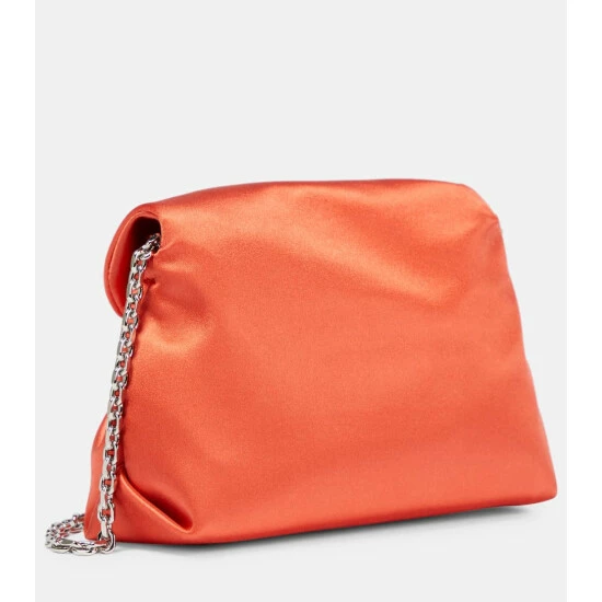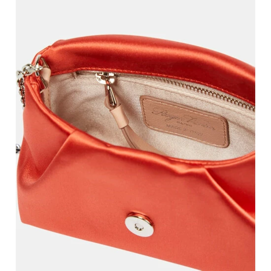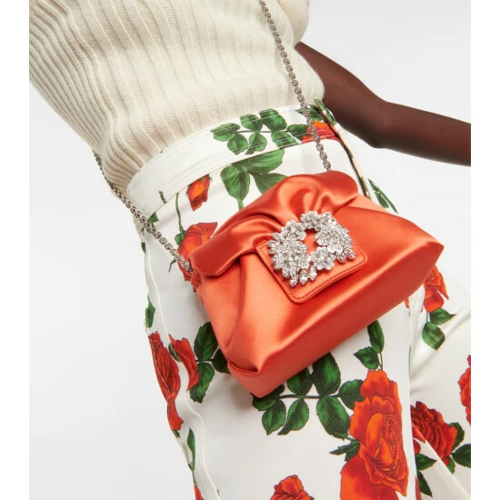 The Bouquet shoulder bag from Roger Vivier has an unstructured profile with soft folds. It’s made from lustrous orange satin and topped with a bouquet-like crystal brooch on the flap.