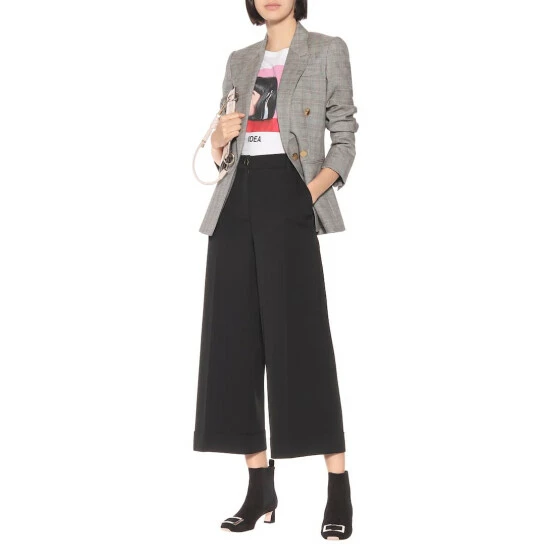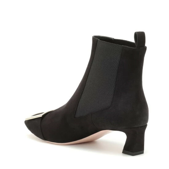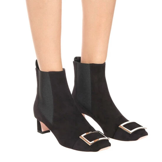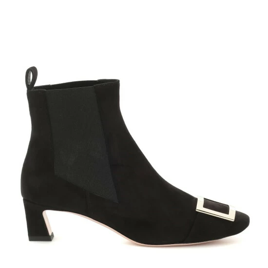 French footwear label Roger Vivier draws upon ’70s style as inspiration for the Trompette ankle boots. Crafted in Italy from black suede, the Chelsea style has elastic insets at the sides, a curved kitten heel, and, of course, the signature polished buckle at the toe.