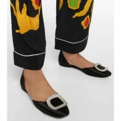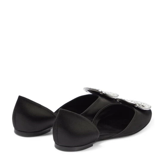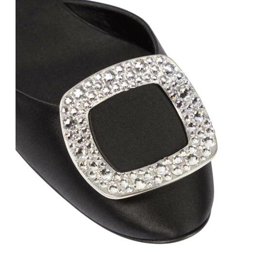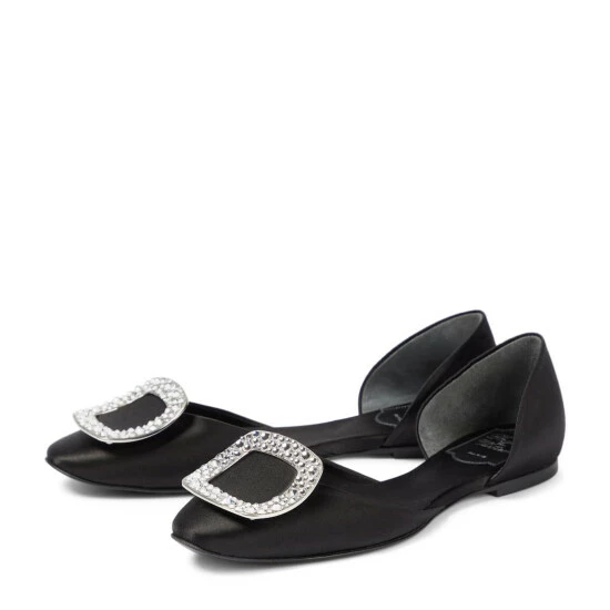 Featuring the label’s signature buckle in bright silver-tone metal with crystals, Roger Vivier’s ballerinas are a glitzy, sophisticated flat option. We love the open D’orsay-style sides and super-glossy satin.