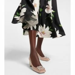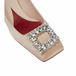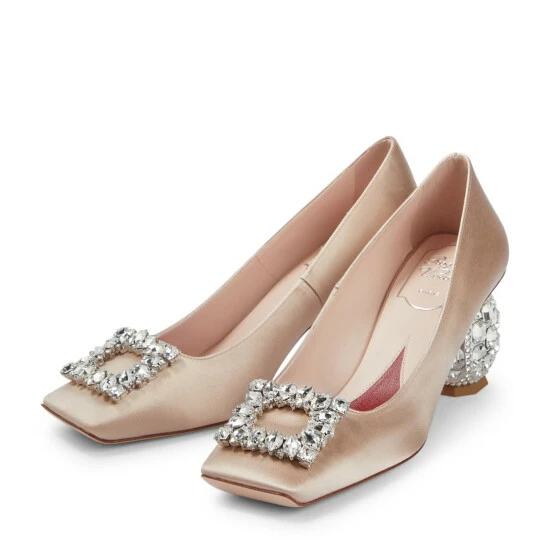 Embellished with a strass buckle, these Roger Vivier shoes command attention with Swarovski® crystal adornments. The pumps are handcrafted from satin with square toes and round block heels that are themselves entirely covered in bright rhinestones.