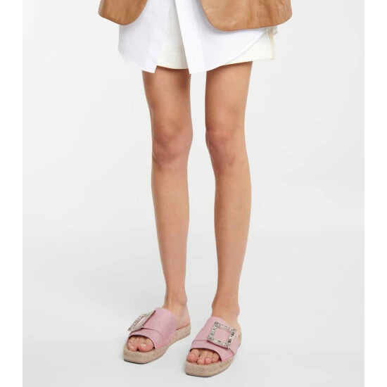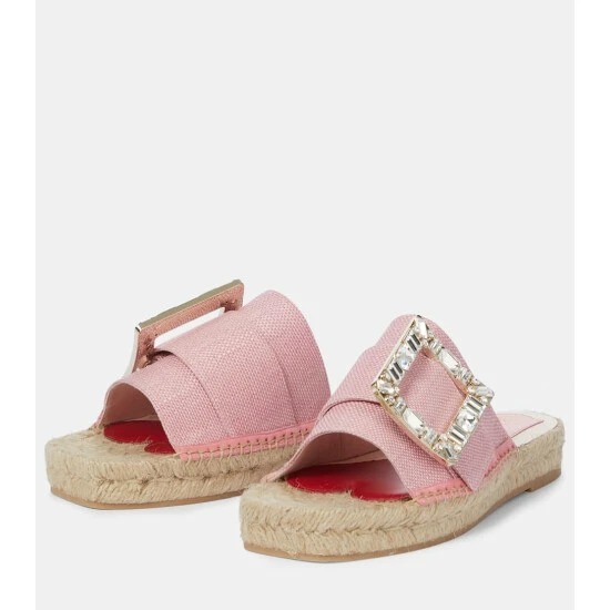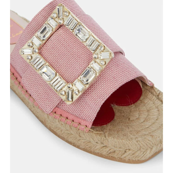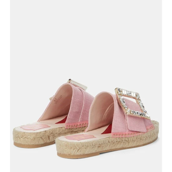 Roger Vivier gives a classic style a high-octane update, adorning these espadrille slides with signature strass buckles. This Mytheresa-exclusive pair is set on braided jute soles and features wide canvas straps in pale pink. Style yours with a flowing maxi dress and a raffia basket bag this summer.