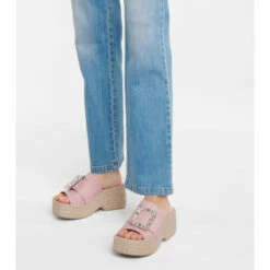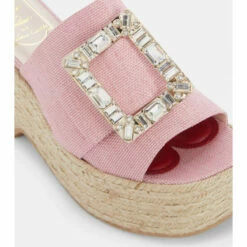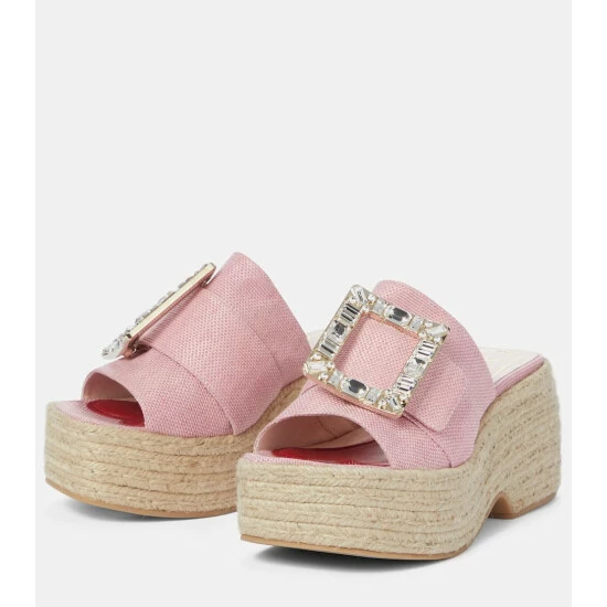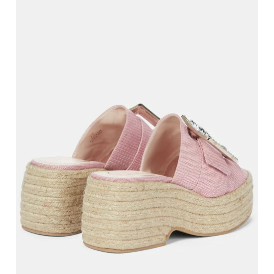 Roger Vivier gives a classic style a high-octane update, adorning these espadrille sandals with signature strass buckles. This Mytheresa-exclusive pair is set on braided platform jute soles and features wide canvas straps in pale pink. Style yours with a flowing maxi dress and a raffia basket bag this summer.