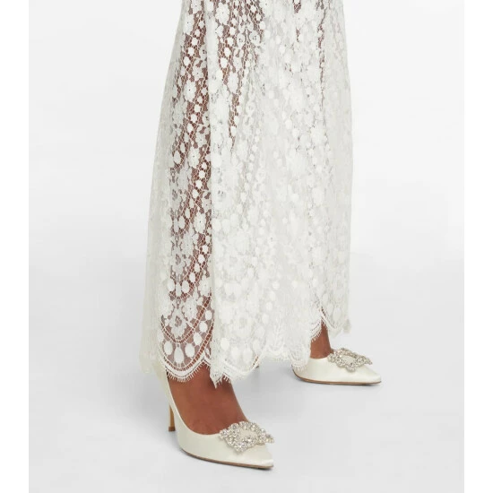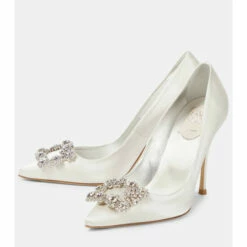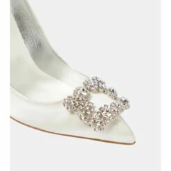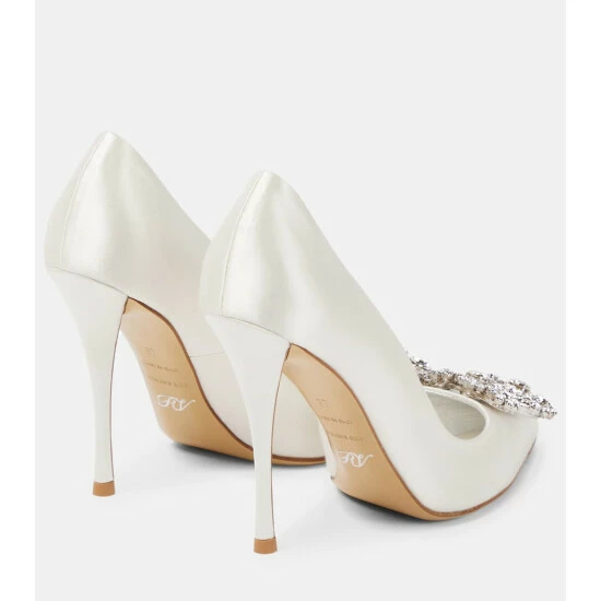 Made from lustrous satin with decadent crystal embellishments, the Roger Vivier Flower Strass pumps are worthy of any special event. This white pair has sharply pointed toes and 100mm stiletto heels.