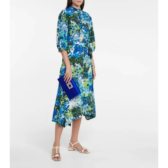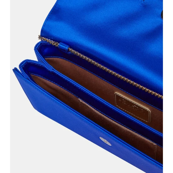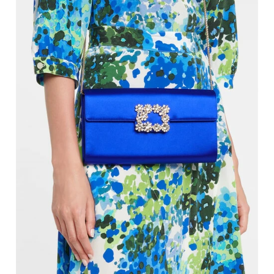 Your social events will benefit from this blue Flower Strass clutch from Roger Vivier. Made from lustrous satin with a decadent chain shoulder strap, it’s accented with a signature crystal buckle at the fold-over top.