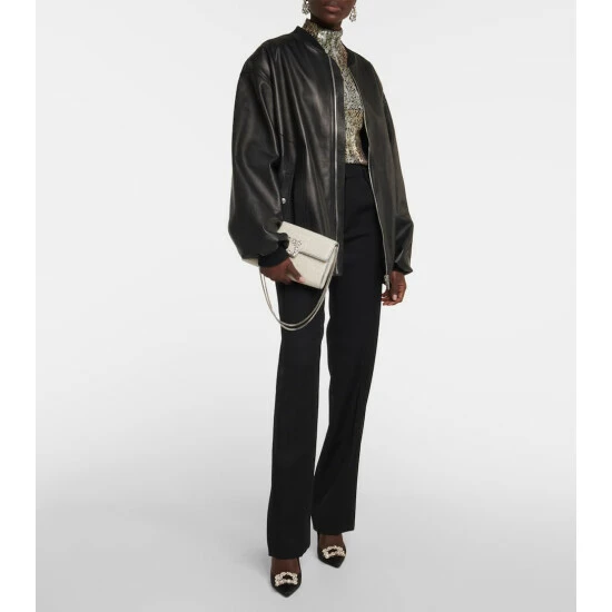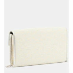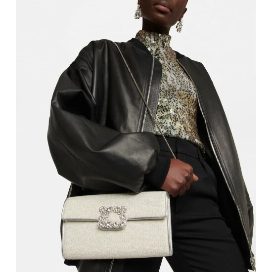 Your social events will benefit from this cream Flower Strass clutch from Roger Vivier. Made from metallic tweed with a decadent chain shoulder strap, it’s accented with a signature crystal buckle at the fold-over top.