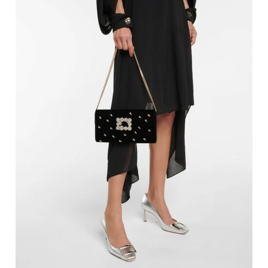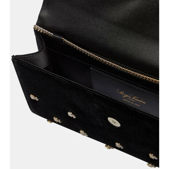 Your social events will benefit from this black Flower Strass clutch from Roger Vivier. Made from plush velvet with a decadent chain shoulder strap, it’s accented with a signature crystal buckle at the fold-over top.