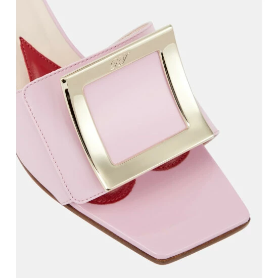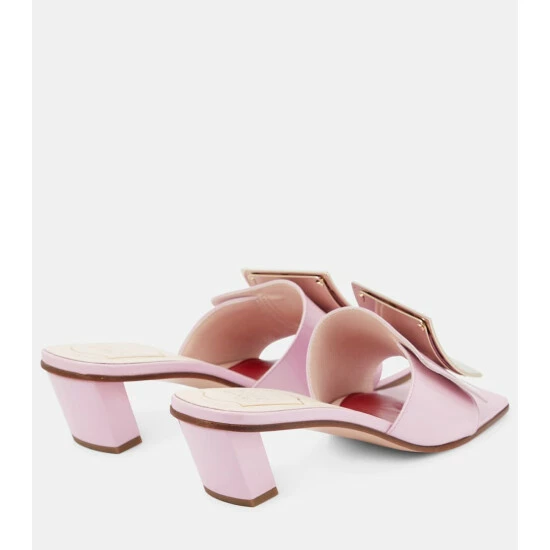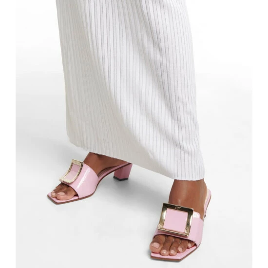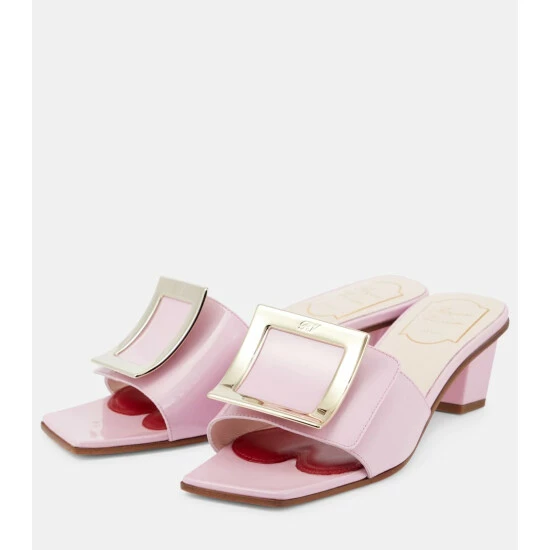 Roger Vivier’s designs are instantly recognizable from the oversized squared buckles. The Love Vivier sandals are made of pink patent leather, set on low heels, and finished with a squared open toe.