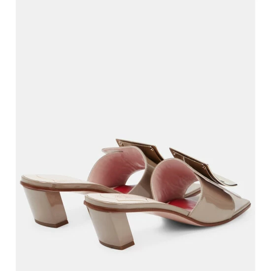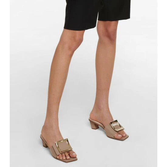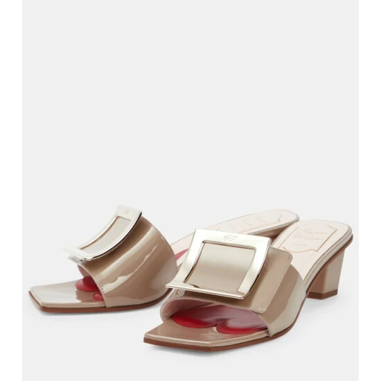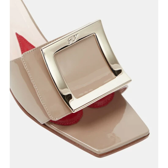 Roger Vivier’s designs are instantly recognizable from the oversized squared buckles. The Love Vivier sandals are made of beige patent leather, set on low heels, and finished with a squared open toe.
