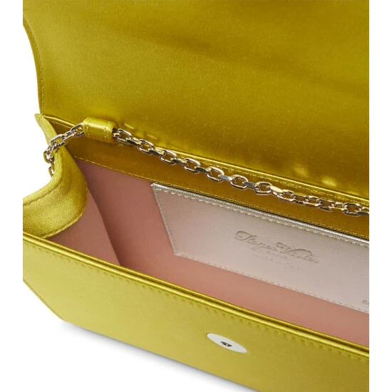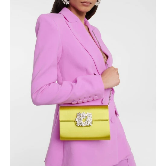 Polish off showstopping occasionwear with Roger Vivier’s RV Bouquet clutch. This bright yellow style is made in Italy from lustrous satin and features a floral Swarovski crystal-embellished buckle that’s hand-placed by skilled artisans.