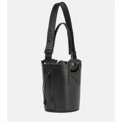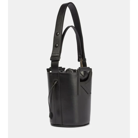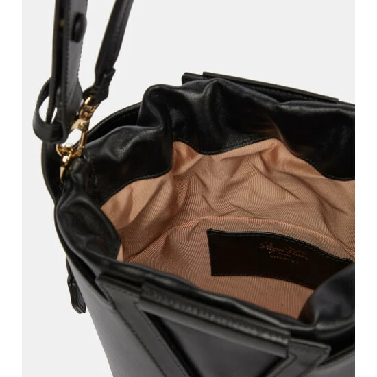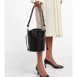Roger Vivier continues to add glamour to your accessories with the RV Bucket shoulder bag. Made from black leather with striking monogram top handles, it’s lined with a luxe suede drawstring interior.