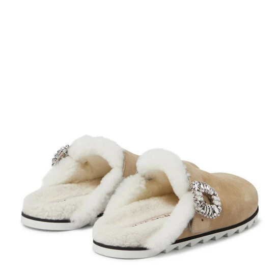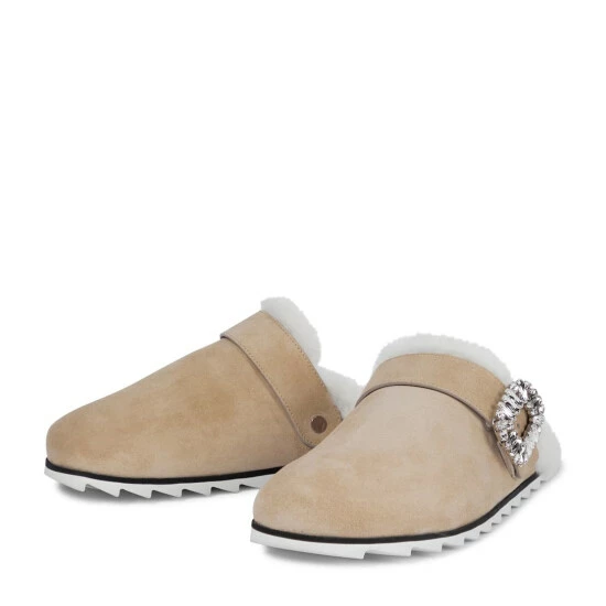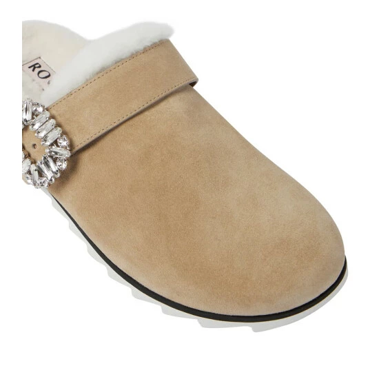 Slip your soles into the beige suede Slidy Viv’ slippers from Roger Vivier. They’re lined with tactile shearling and accented with signature Strass crystal buckles. Shark-toothed soles ensures they can be worn outdoors with ease.