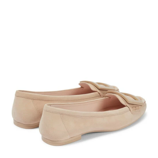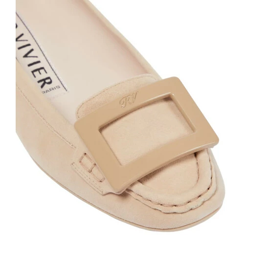 These loafers from Roger Vivier are handcrafted in soft suede with raised textured stitching on the uppers. The highlights of this style are the signature lacquered buckles that bear the house’s monogram.