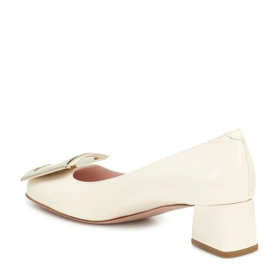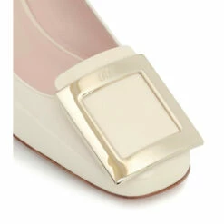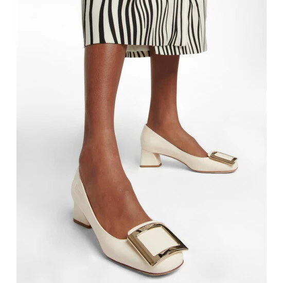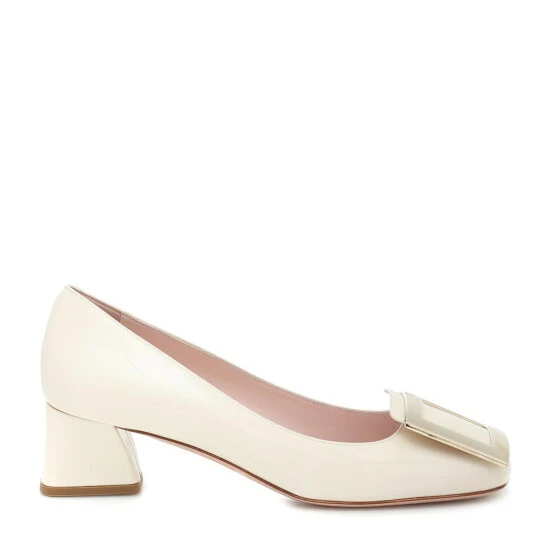 A contemporary take on a style from the ’60s, this iteration of the Très Vivier pumps from Roger Vivier arrives in creamy white patent leather. The Italian-crafted pair sits atop jaunted 45mm block heels, and is finished with instantly recognizable golden buckle embellishments atop the toes.