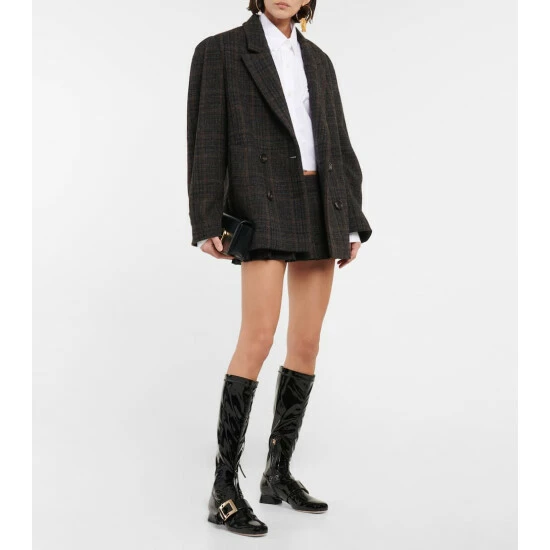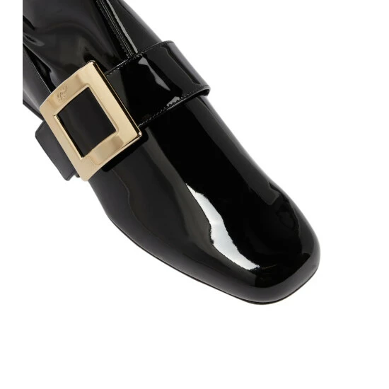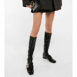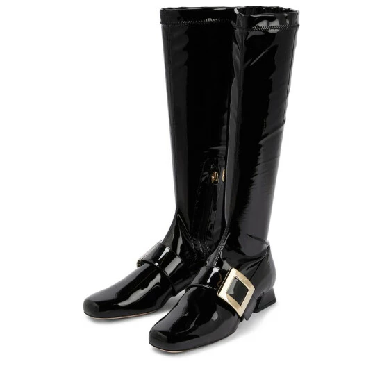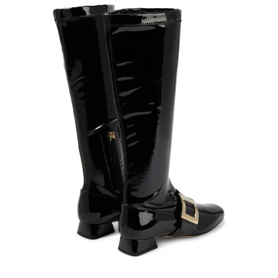 These knee-high boots from Roger Vivier are made from patent leather and adorned with square buckles that bring to mind the brand’s iconic Belle Vivier design. They have low block heels and zipped sides.
