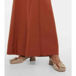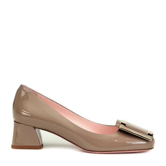 The latest addition to Roger Vivier’s footwear family, the Très Vivier pump continue the brand’s timeless legacy. Crafted in Italy from glossy beige-hued patent leather, the design features a polished golden square buckle, which is engraved with the label’s initials. The modest block heel has an angular silhouette that is perfect for city strolls.