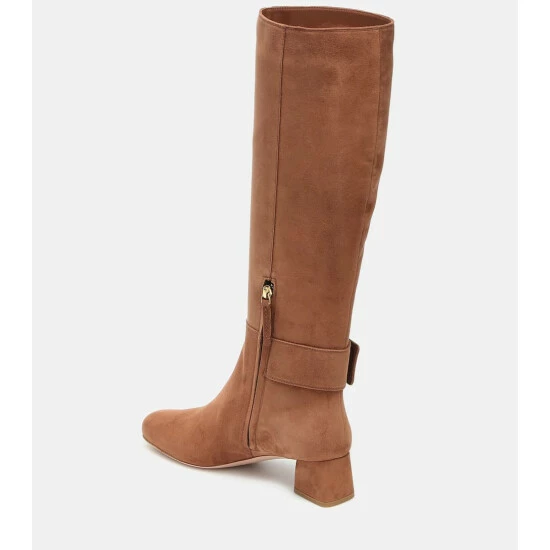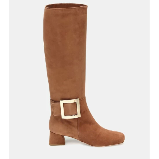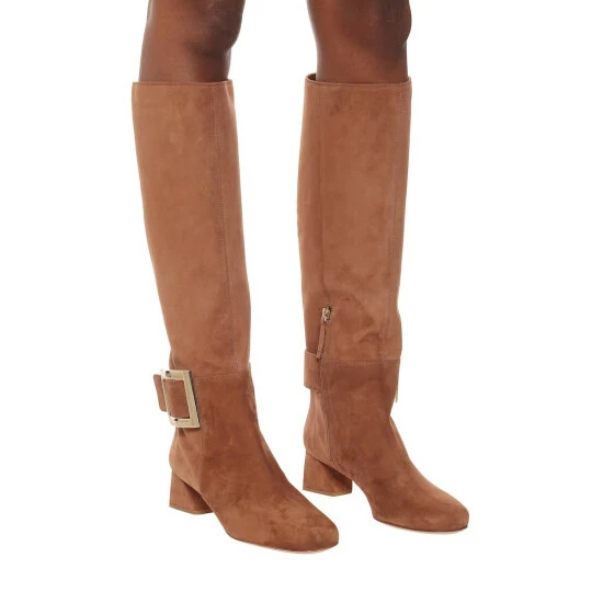 Transition into the colder months with elegance wearing the knee-high Très Vivier boots from Roger Vivier. Made from smooth brown suede, they have square toes, sculptural block heels and easy-fastening zipped sides. They’re finished with polished buckles at the sides – a longtime signature of the French footwear label.