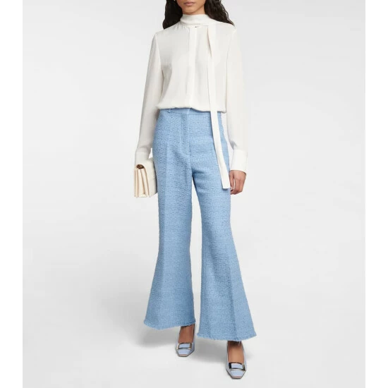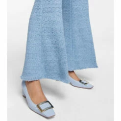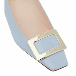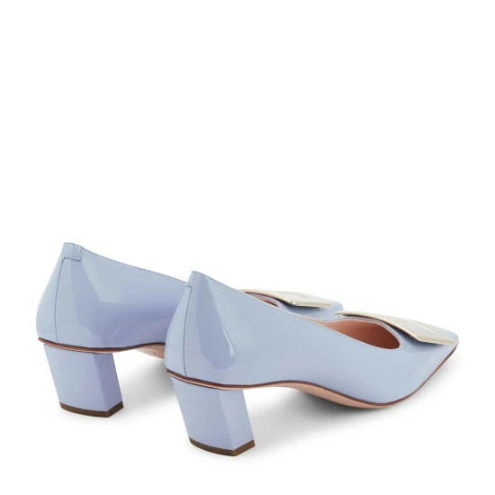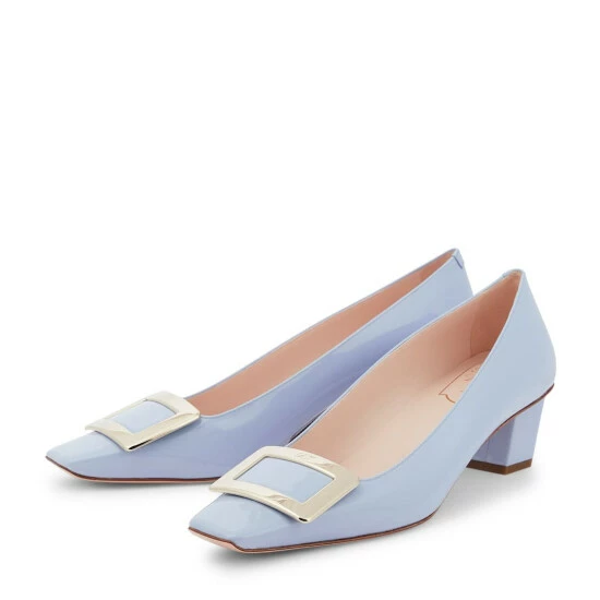 Roger Vivier’s signature Trompette pumps are reimagined for the season in a delicate light blue. Made in Italy from patent leather, they have square toes, logo-engraved buckles, and are set on slanted 45mm block heels.