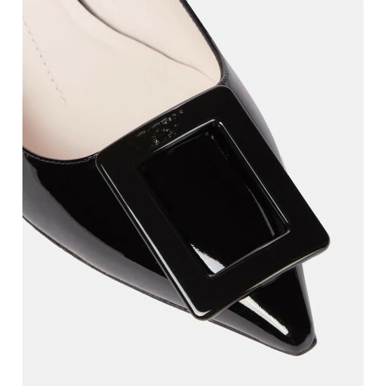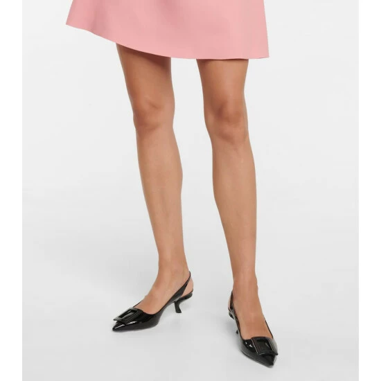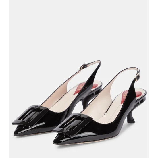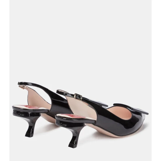 These Roger Vivier pumps date from 1963, and are named after their lacquered “Virgule” heels of 55mm. The slingback pair are made from black patent leather, with pointed toes bearing the house’s signature embossed buckles.