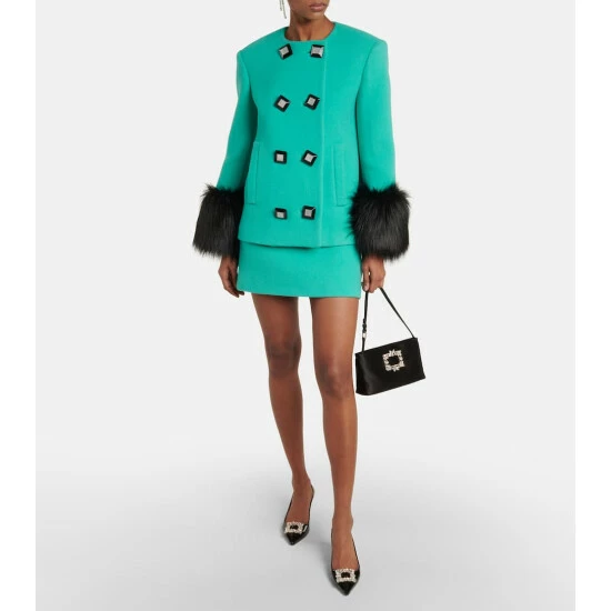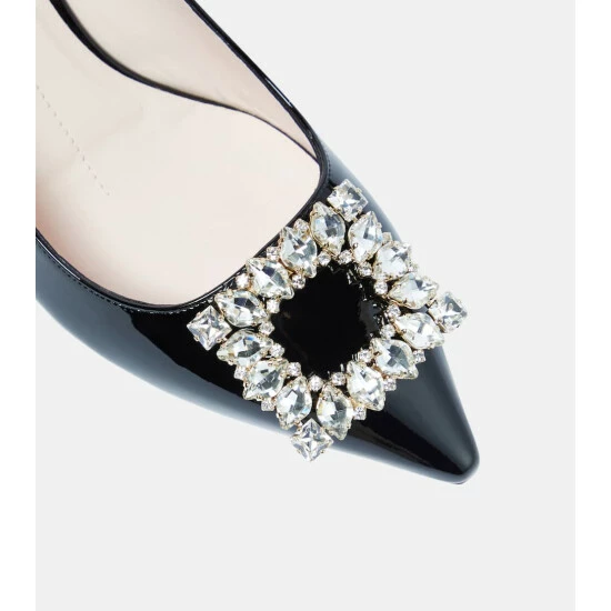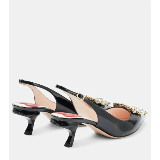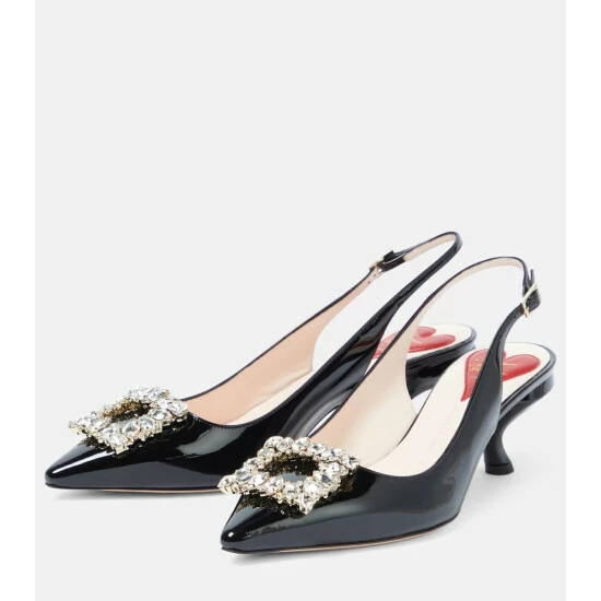 The Virgule slingback pumps are set atop curved comma-shaped heels, first introduced by Roger Vivier in 1963. The patent leather pair is adorned with a crystal-embellished buckle.