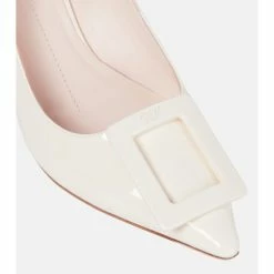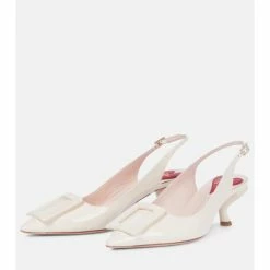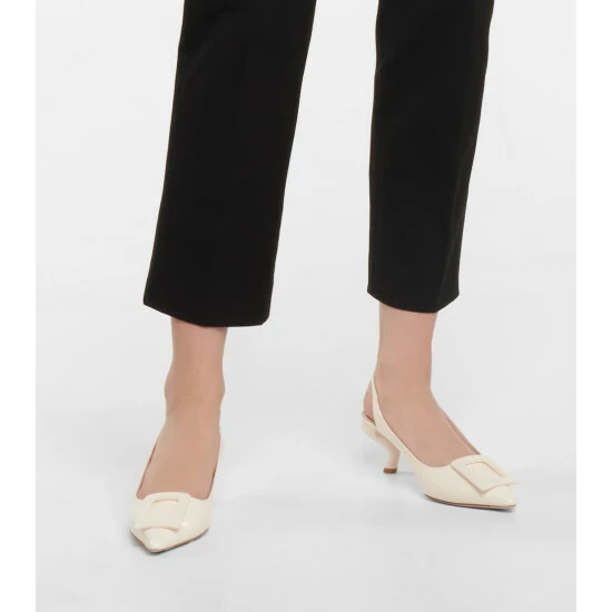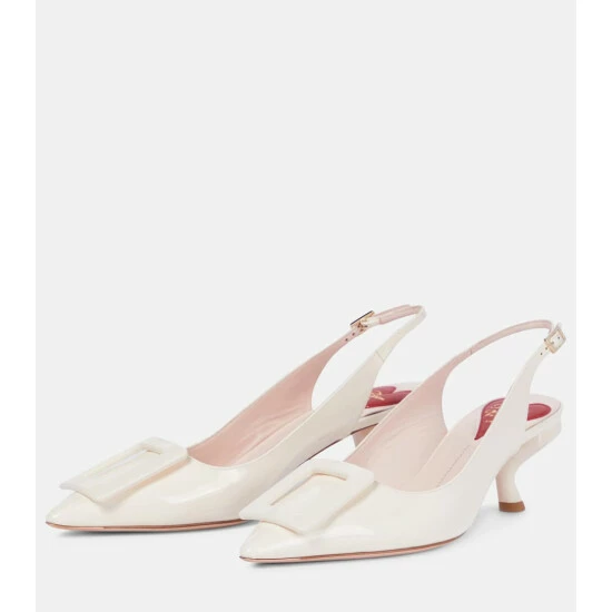 Set on a 55mm kitten heel, these white Roger Vivier patent leather pumps have slingback design with a gold-tone buckle fastening. With a feminine pointed toe, they are finished with a tonal signature square buckle at the vamp.