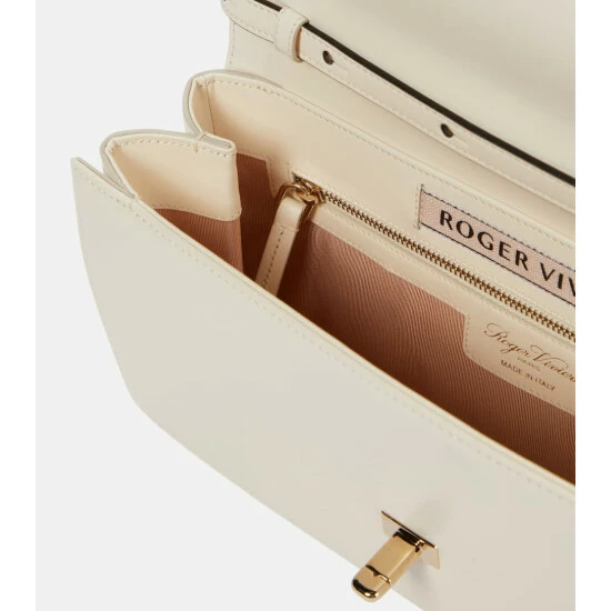 The Viv’ Choc shoulder bag from Roger Vivier is a clean-lined design in white leather. It has an envelope silhouette, a jewelry-inspired turn-lock fastening and multiple interior slots for storing essentials.