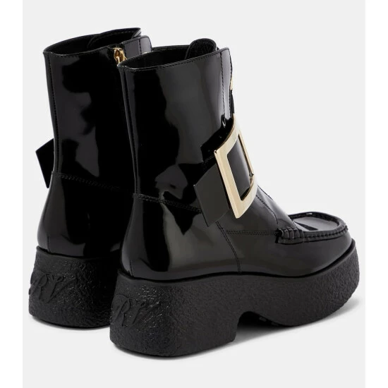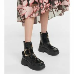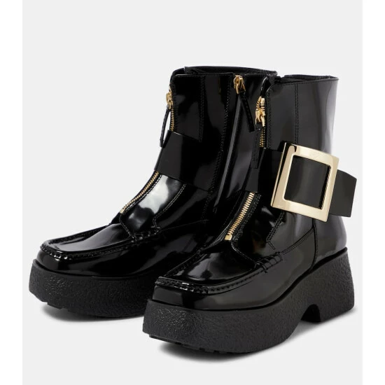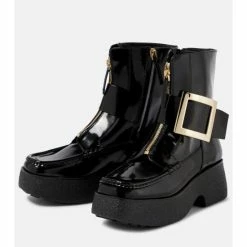 Roger Vivier ensures footwear for unpredictable weather is an elegant affair with the Viv’ Clog ankle boots. They’re made from black patent leather with zipped tongues and signature buckled sides. Textured rubber outsoles make for durable wear.