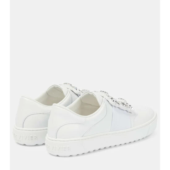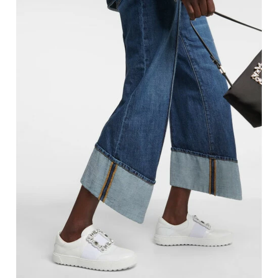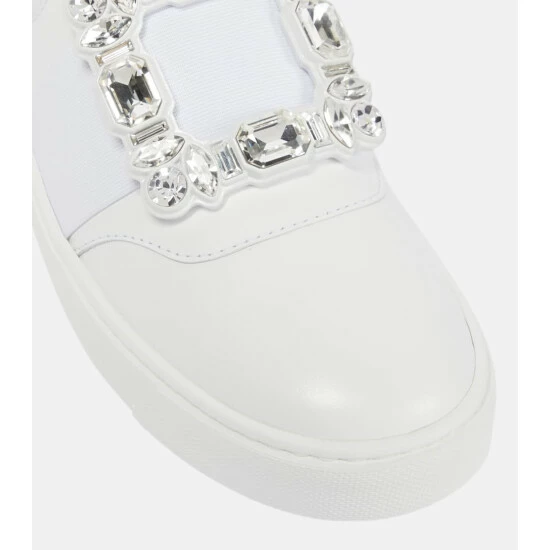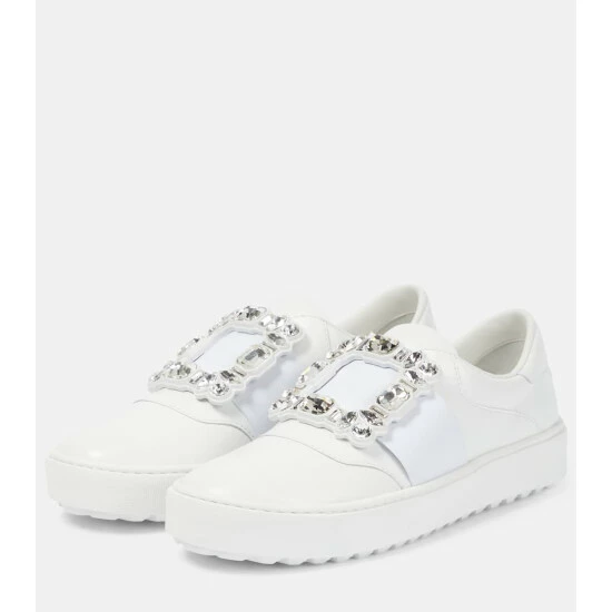 Roger Vivier’s Viv’ Strass Buckle Golf sneakers marry high fashion with streetwear. This slip-on pair is made from white leather and rests on logo-embossed rubber soles.
