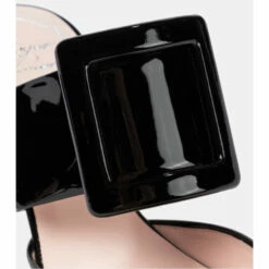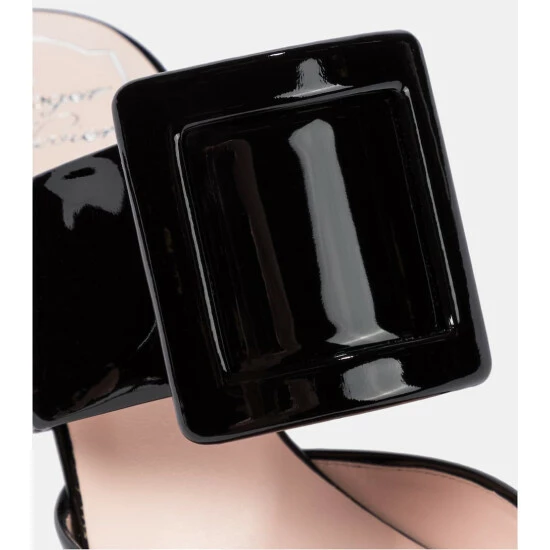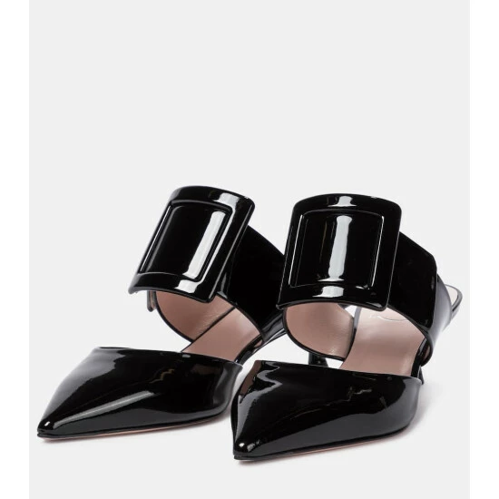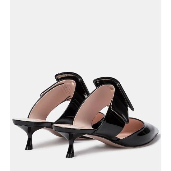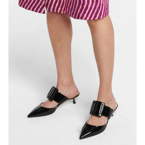 Sophistication comes easily to those who slip on the Viv’ In The City mules from Roger Vivier. Made from patent leather, the glossy black design is shaped with piercing point toes and secures with signature buckled straps across the arches. Note the curvaceous kitten heels for a touch of elevation.