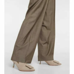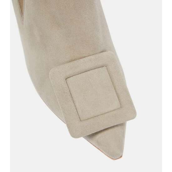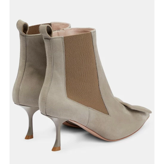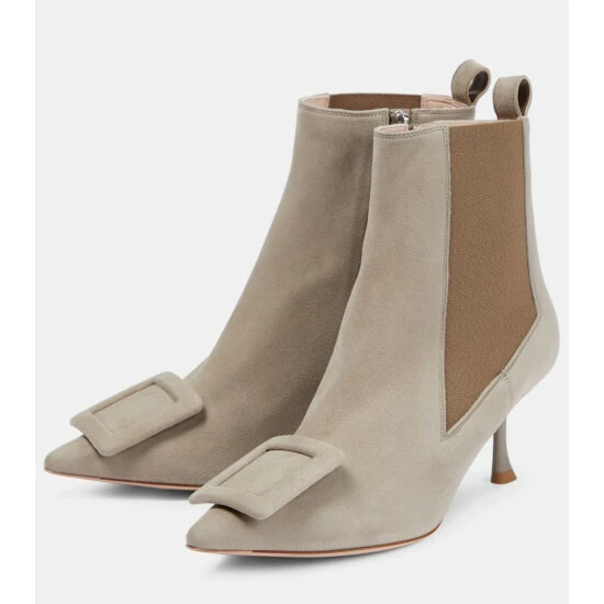 The Viv’ in The City suede ankle boots from Roger Vivier feature the house’s signature buckle in a soft suede tone-on-tone design. This style has an inside zip, elastic side inserts, and a slim lacquered heel.