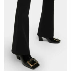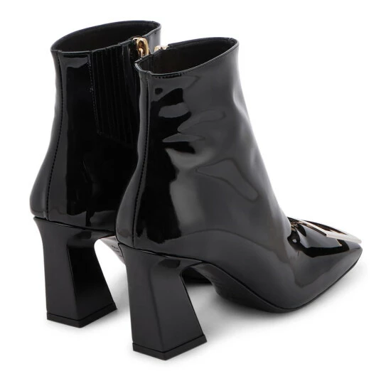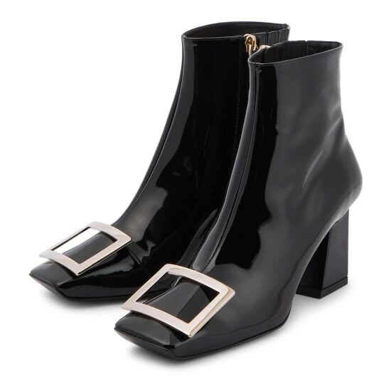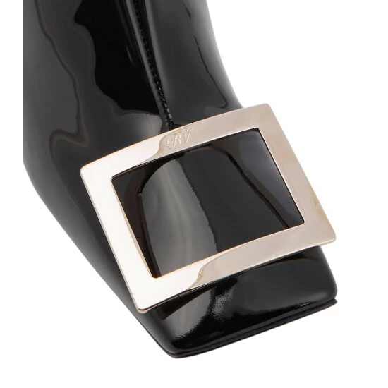 Made from glossy black leather, these boots from Roger Vivier have squared toes, sculptural block heels and the label’s signature strass buckles.