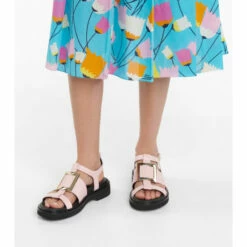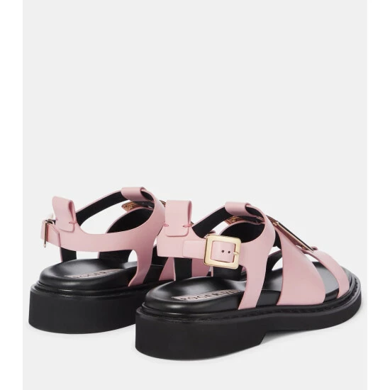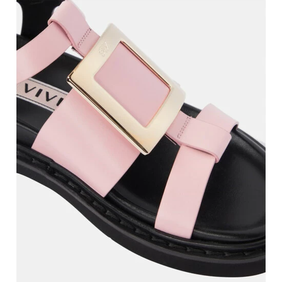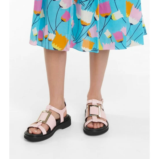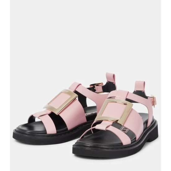 Roger Vivier reimagines its iconic Viv’ Rangers style in a sandal silhouette for the warmer months. Designed exclusively for Mytheresa, this pink leather pair is set on flat rubber soles with buckle fastenings at the ankles, and features the label’s signature logo-engraved golden buckles.