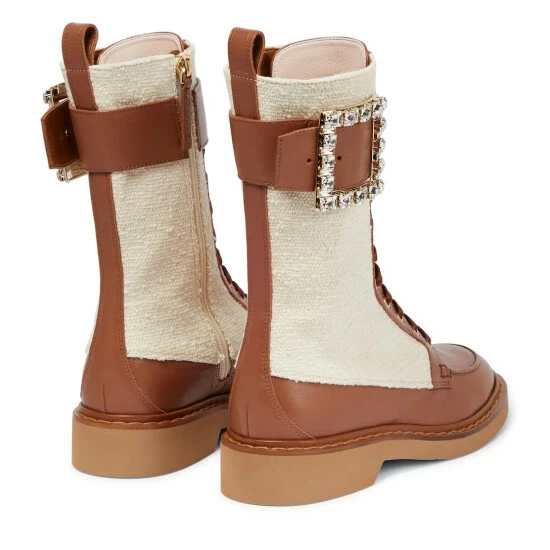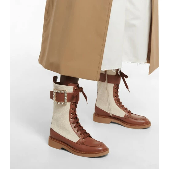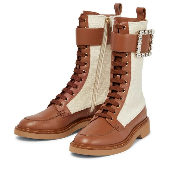 Roger Vivier reinvents the lace-up ankle boot with the Viv’ Rangers design. This pair is made from paneled canvas and leather with zipped sides and signature crystal-studded buckles.