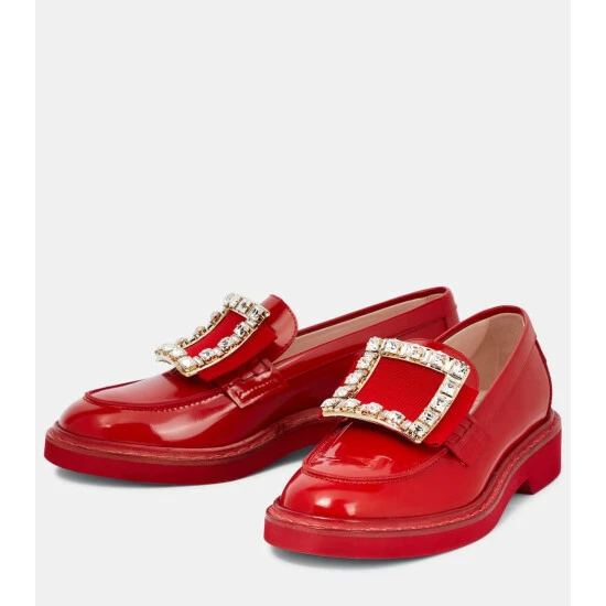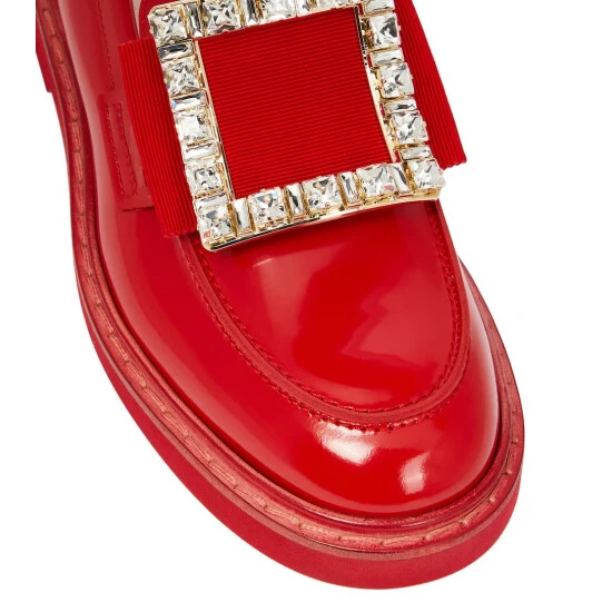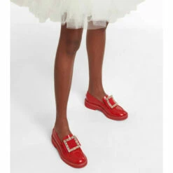 Roger Vivier’s glistening strass buckles have given the label the moniker ‘Fabergé of Footwear’. The Viv’ Rangers loafers are made from polished red leather with grosgrain straps.