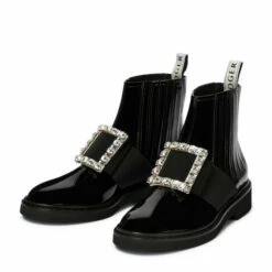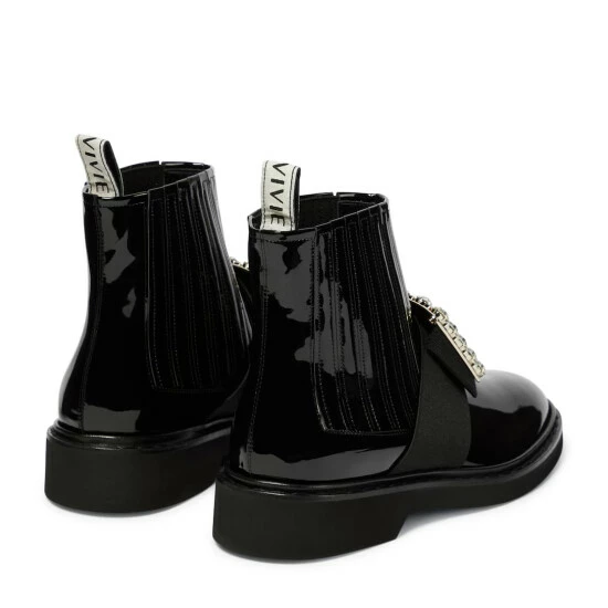 Roger Vivier reinvents the classic Chelsea boot silhouette by rendering it in glossy patent leather. Crafted in Italy, the Viv’ Rangers style is topped with signature crystal embellishment, and features elasticated sides and a logo pull tab. Wear with a shift dress for a mod touch.