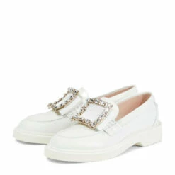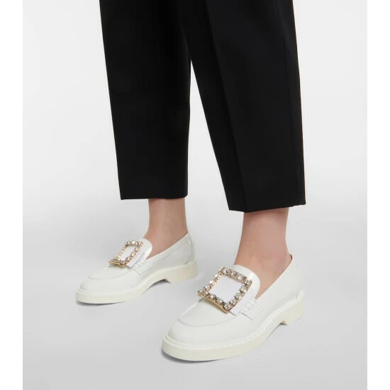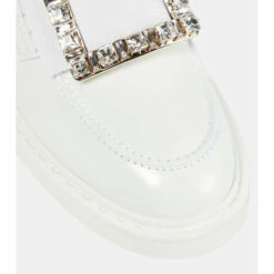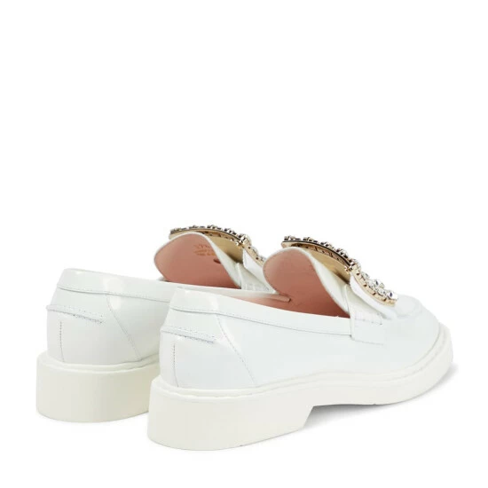 Pretty but tough, Roger Vivier’s Viv’ Rangers loafers strike a balance between feminine and masculine. Handmade in Italy from white patent leather, they’re topped with grosgrain-backed rhinestone buckles and set on elevated rubber soles.