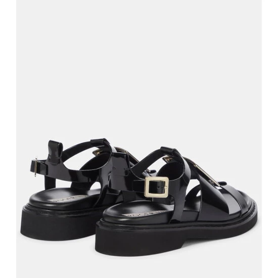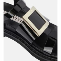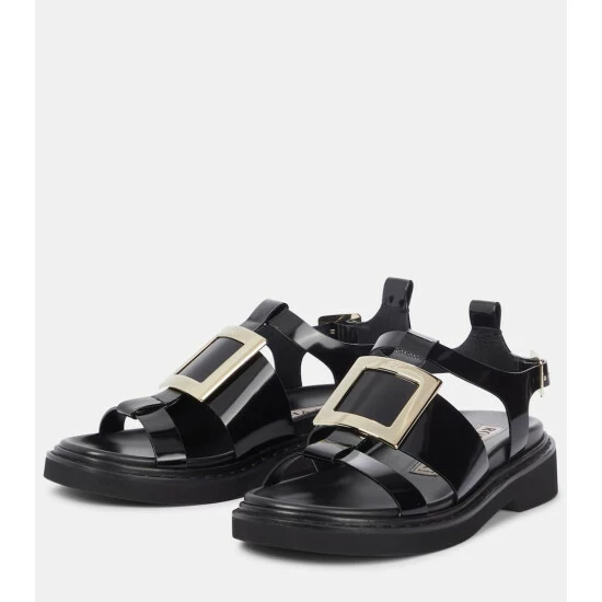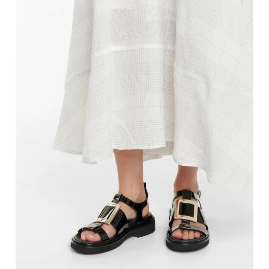 Roger Vivier reimagines its iconic Viv’ Rangers style in a sandal silhouette for the warmer months. Designed exclusively for Mytheresa, this black patent leather pair is set on flat rubber soles with buckle fastenings at the ankles, and features the label’s signature logo-engraved golden buckles.