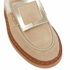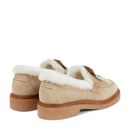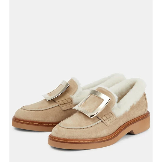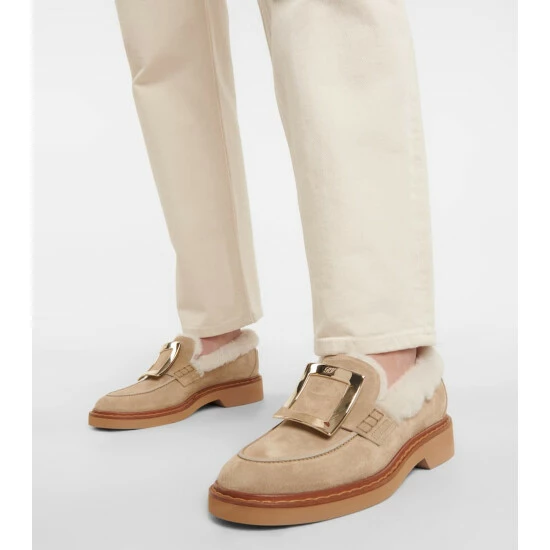 Roger Vivier’s Viv’ Rangers loafers strike the balance between glamour and practicality. Made from supple beige suede and lined with soft shearling, they’re topped with signature curved buckles.