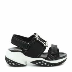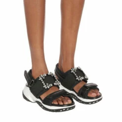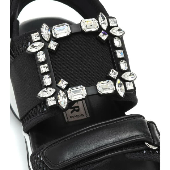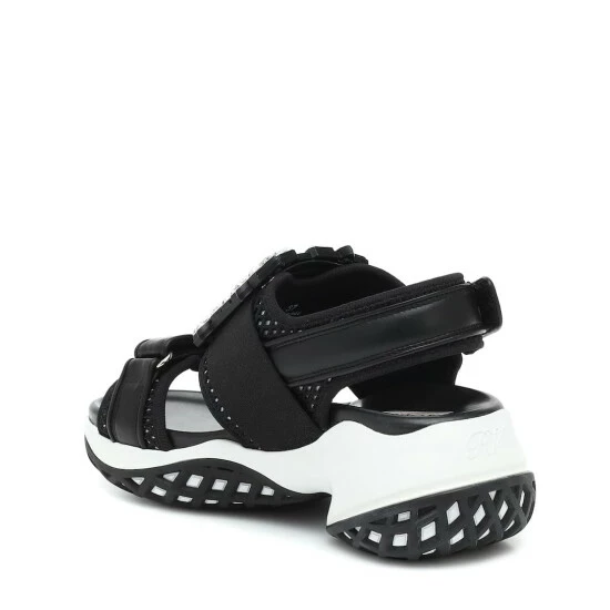 Roger Vivier offers an irreverent take on a classic summer style with its Viv’ Run sandals. The chunky silhouette is made from mix mediums, including smooth leather straps, technical mesh trim, and the label’s iconic strass buckle details. The monochrome colorway makes the sporty pair chic enough for casual office ensembles.