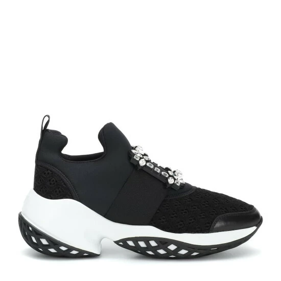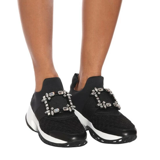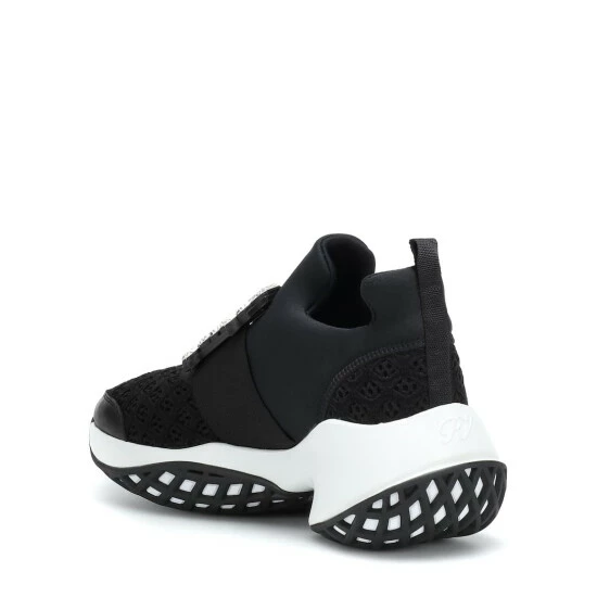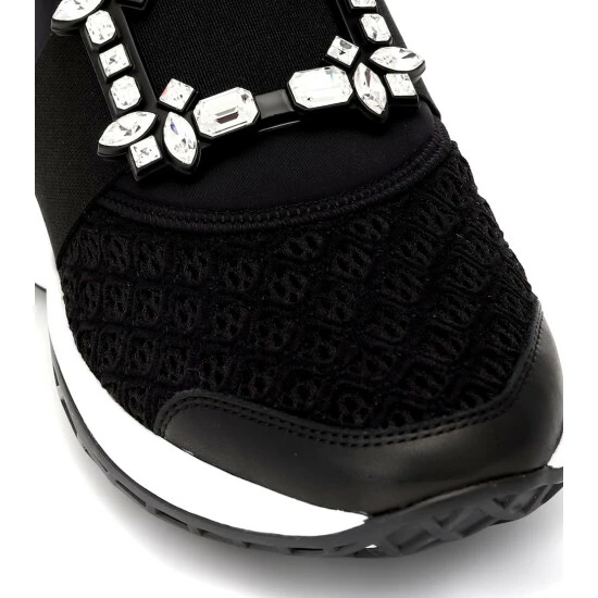 Roger Vivier offers a glamorous take on athletic style with the Viv’ Run sneakers, incorporating symbolic elements from the label. Crafted in Italy from black scuba fabric and mesh, the design features the iconic crystal-embellished buckle of the Belle Vivier style, and a molded rubber outsole inspired by the Choc heel. Wear yours for errands about-town or dashing between appointments.
