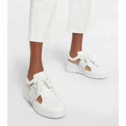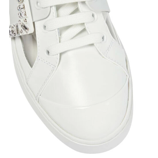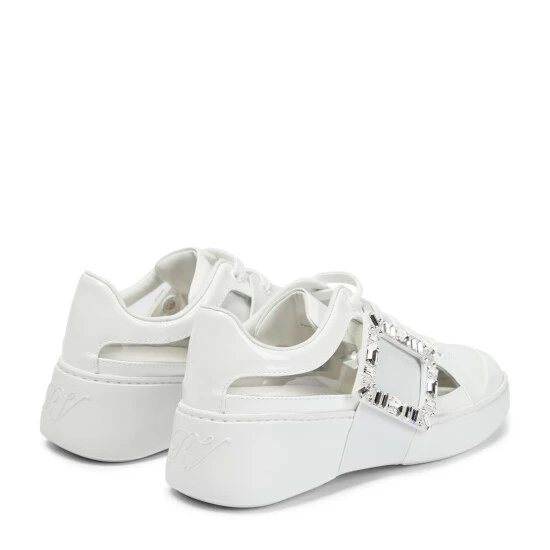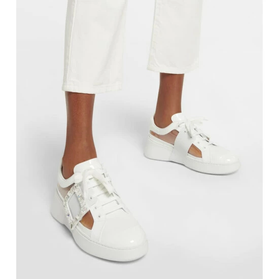 Not your average sneakers: Roger Vivier’s Viv’ Skate style impeccably blends casualness and glamour. Made from PVC and smooth leather, the uppers are adorned with angular crystal buckles.