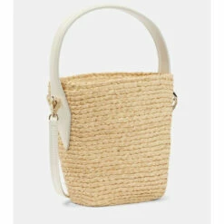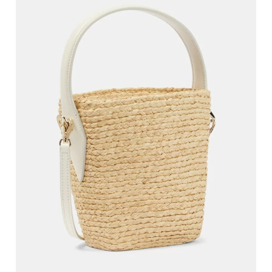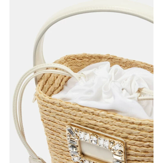 Roger Vivier’s signature strass embellishment adds a glamorous twist to this mini-sized basket bag. The Viv’ Skate style is defined by its raffia construction, leather trim, and drawstring closure.