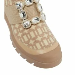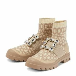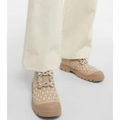 The Walky Viv’ ankle boots from Roger Vivier are ideal for walks in nature or city strolls. Set atop a sturdy rubber sole, the beige style features a jacquard fabric upper with a crystal-embellished buckle.