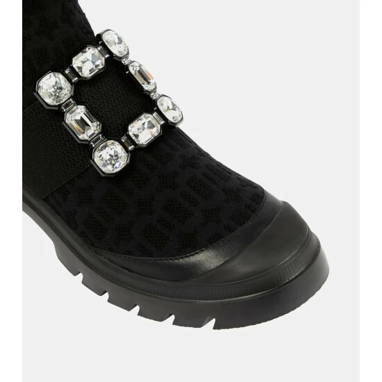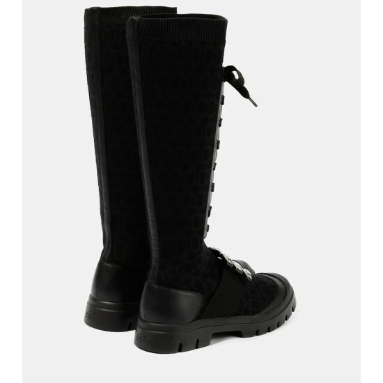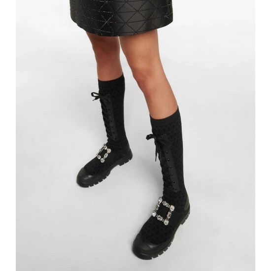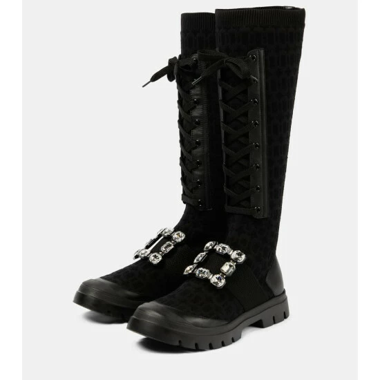 Edgy and fashion-forward, Roger Vivier’s Walky Viv’ boots are designed for a snug sock-like fit with a lace-up front. They’re made from stretchy fabric with an all-over jacquard monogram motif and topped with a crystal buckle.
